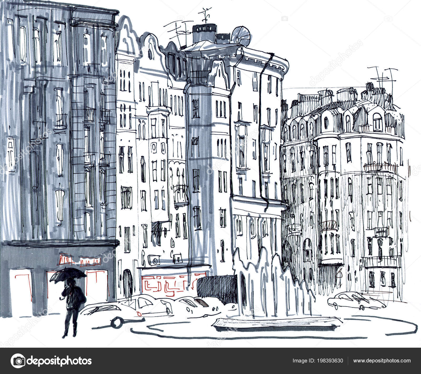 City Scene Sketchy Style Hand Drawn Marker Pen Illustration In Shades Of Gray Rainy Day Old Houses Street Fountain Cars Human Figure With Umbrella Saint Petersburg Russia Stock Illustration By C Naktisart 198393630